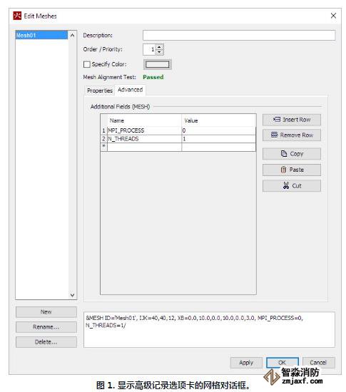 在PyroSim中,附加字段表被添加到網格編輯對話框的選項卡中,這一新功能允許您額外的MPI和OpenMP參數添加到PyroSim中的每個MESH行,而不需手動導出和編輯文件從命令行運行。http://pg.xfjcyq.com/