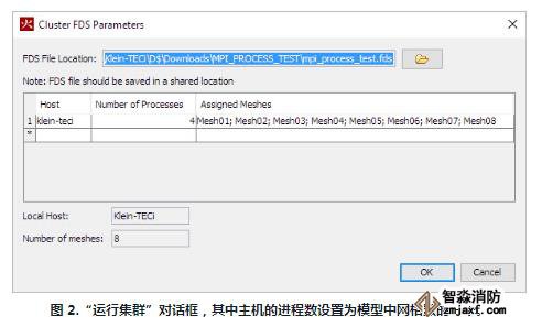 PyroSim中的Run FDSParallel選項將自動設置MPI進程數等于模型中的網格數。要在PyroSim中使用MPI_PROCESS功能,您需要控制啟動模擬的MPI進程總數。這通過使用Run FDS Cluster選項而不是Run FDS Parallel 來完成。在圖 2在下面,您可以看到本地計算機如何使用單個主機名。然后,當您在右側的列表和表下方的字段中看到 8 個網格時,該主機的進程數設置為數字 4。在這種情況下,將啟動 4 個進程,并分配 2 個網格通過MPI_PROCESS參數添加到附加網格記錄中指定的每個進程。