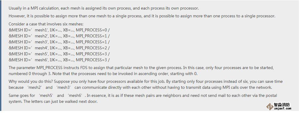 對于使用火災動力學模擬器(FDS)的典型建筑設計計算,將模擬大量空間。為了描述這個計算體積,整個體積的一個或多個子部分被稱為“網格”,并由輸入文件中的&MESH條目定義。在許多情況下,需要不同分辨率的多個網格來準確定義模擬的計算域。大多數現代計算機的每個處理器都有多個“核心”和“線程”,并且通過消息傳遞接口(MPI)功能,FDS允許使用MPI_PROCESS將每個網格分配給給定線程關鍵詞。此功能允許將任意數量的網格同時分配同一處理器以提高計算效率。有關MESH記錄上的MPI_PROCESS和N_THREADS參數的更多信息,下面引用了該部分相關的部分以供參考: