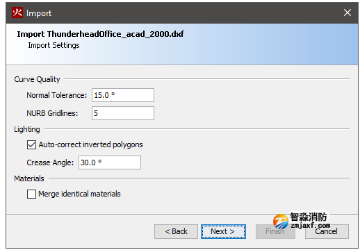 與Completely replace當前PyroSim模型的FDS導入不同,CAD導入將數據附加到當前模型中。這有助于將數據從多個CAD文件導入到一個PyroSim模型中。當建筑物的每個樓層有一個藍圖或3D建筑物已分為幾個部分,每個部分都放在一個單個的文件中時,這很有用。