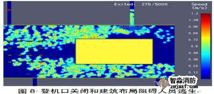 根據(jù)模擬結(jié)果能夠看出,室內(nèi)建筑布局結(jié)構(gòu)往往會(huì)對(duì)人員疏散的速度產(chǎn)生很大影響。當(dāng)室內(nèi)建筑物布置過多或過于集中,通道設(shè)置不合理,會(huì)嚴(yán)重影響人員緊急疏散的效率。如圖 8,該候機(jī)區(qū)域的椅子分布面積過大、擺放間距過寬,對(duì)部分人員的撤離造成了一定的阻礙。 因此在日常維護(hù)和管理中,注重功能建筑設(shè)置的科學(xué)性。對(duì)重點(diǎn)防火單位,如書店和服飾店, 應(yīng)盡量保證不能將其挨在一起設(shè)置,避免起火時(shí)火勢容易迅速蔓延的情況發(fā)生。