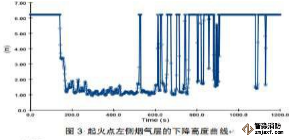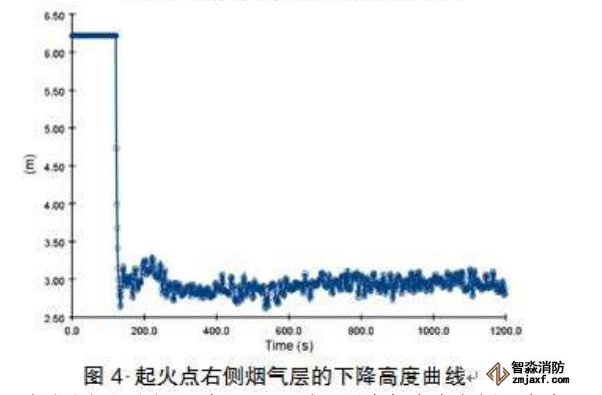 H s 為煙氣層高度; H p 為人眼特征高度; H b 為建筑物頂棚高度; H c 為對(duì)人構(gòu)成危險(xiǎn)的臨界高度。設(shè)人眼高度為 1. 7 m, 則通過上公式可知該防火分區(qū)發(fā)生火災(zāi)時(shí), 煙氣層對(duì)人構(gòu)成危險(xiǎn)的臨界高度為 2. 4 m。 當(dāng)煙氣層的高度下降到 2. 4 m 時(shí), 對(duì)人員構(gòu)成危險(xiǎn)。 如圖 3、 圖4 為起火點(diǎn)兩側(cè)在整個(gè)模擬過程中煙氣層的下降高度圖。