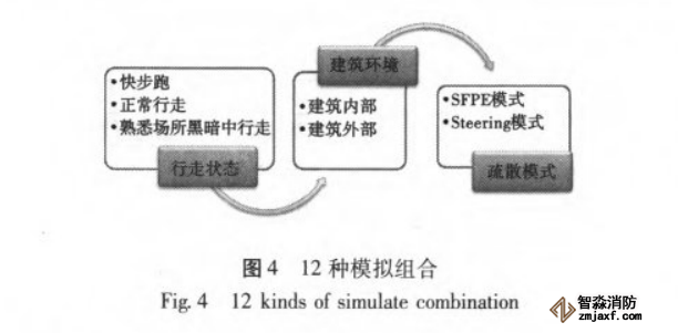 據(jù)前所述, pathfinder軟件有兩種疏散模式進(jìn)行選擇。 現(xiàn)采取其兩種疏散模式即SFPE模式和Steering模式, 對(duì)建筑內(nèi)外的人員進(jìn)行了模擬, 一共進(jìn)行了12種組合的模擬, 如圖4所示。