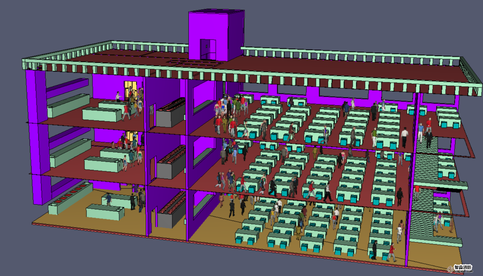 某三層樓食堂火災與疏散模擬分析,食堂分為食品制作區域和就餐區,模擬視頻操作區(廚房)意外著火情況下,火災煙氣蔓延特性以及對人員的危害,進而模擬人員疏散,調整疏散方案至全數人員能夠到達安全區域。