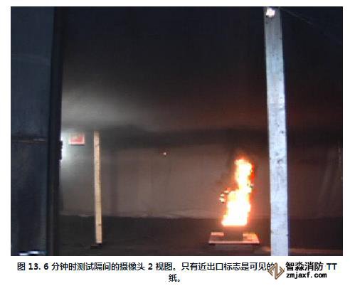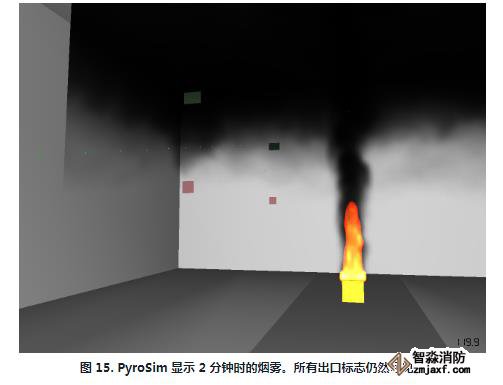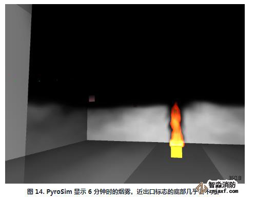 我們還可以與位于通風口外的相機拍攝的圖像進行直接比較。 圖 13顯示了 6 分鐘時的圖片。這可以與圖 14 中的 PyroSim 圖像進行比較,后者顯示的煙霧層稍低。我們還可以看到,在幫助照亮出口標志的實驗中包括了室內照明。如煙層底部的紅色調所示,火也有助于照明。