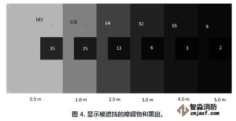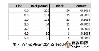 穆赫蘭指出,對于在白色背景下觀察的黑色物體,其值為C=-0.02通常用作定義可見性的對比度閾值。白色障礙物和黑色斑塊的預期光強度在圖3中給出,包括計算出的韋伯對比度。在這個問題中,背景和黑塊都被煙霧同等地遮擋,因此兩者的強度相同地降低并且計算出的韋伯對比度是恒定的。正如將要顯示,可見度隨著模糊度的增加而明顯降低,因此在這種情況下,Weber對比度似乎在計算可見度時沒有用。韋伯對比度的另一個問題是,對于純黑色物體(灰度為0),韋伯對比度方程將給出一個常數值-1.