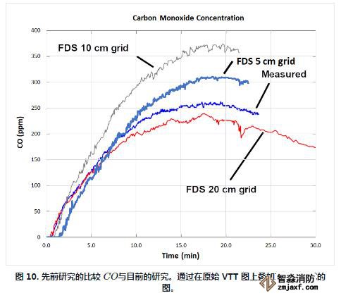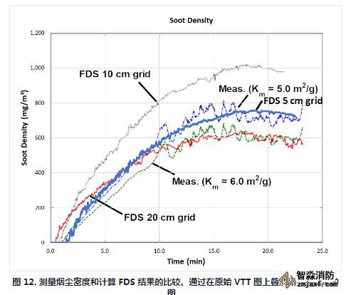 為了比較煙霧引起的能見度和遮擋,我們可以將實驗測量的煙塵密度與 FDS 結果進行比較,圖 12。讀者可以參考 VTT 論文了解密度測量的描述,但該過程使用公式 1、2 和 3,通過計算質量比消光系數作為函數,將使用 MIREX 設備進行的光透射測量轉換為密度的波長。可以看出,5 cm結果落在實驗數據范圍內。