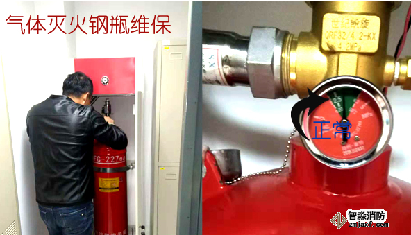 1)檢查每個滅火劑瓶組和驅動氣體瓶組的壓力,壓力表的壓力指示值應在綠色區(qū)域內。