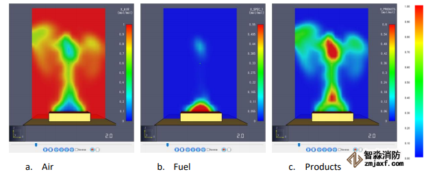 在任何位置,空氣、燃料和產物的體積分數總和為 1。這些量的典型等值線如圖 8 所示。空氣是大部分模型的大部分體積分數。 燃料是從火面釋放出來的產物是由燃料和空氣混合產生的。 每單位體積的熱釋放率 (HRRPUV) 繪圖顯示了燃燒的位置。