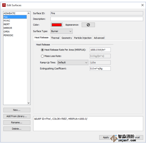 表面用于定義 FDS 模型中對象的屬性。 在此示例中,我們定義了一個燃燒器(火)表面,該表面以對應于 1000 kW/m2 的速率釋放燃料。 默認情況下,FDS 中的所有表面都是 INERT 并保持在固定溫度(通常是環境溫度)。