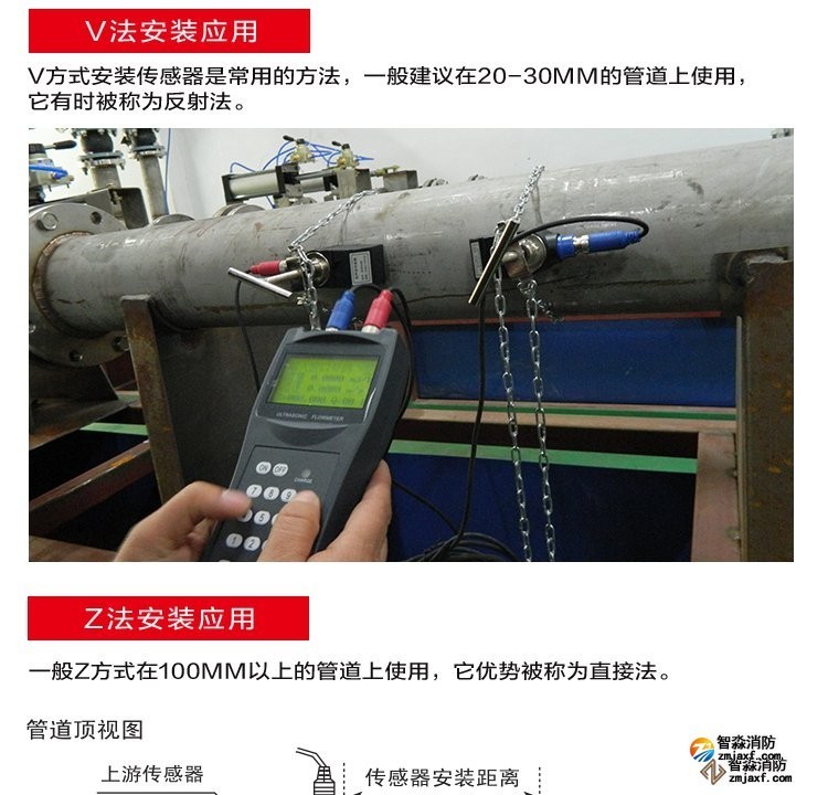 超聲波流量計的傳感器一般采用V方式和Z方式安裝,通常情況下,管徑小于300mm時,采用V方式安裝,管徑大于200mm時,采用Z方式安裝。對于即可以用V方式安裝又可以Z方式安裝的傳感器,盡量選用Z方式。實踐表明,Z方式安裝的傳感器超聲波信號強度高,測量的穩定性也好,圖2。