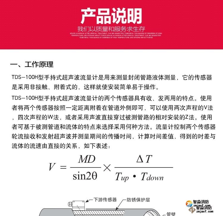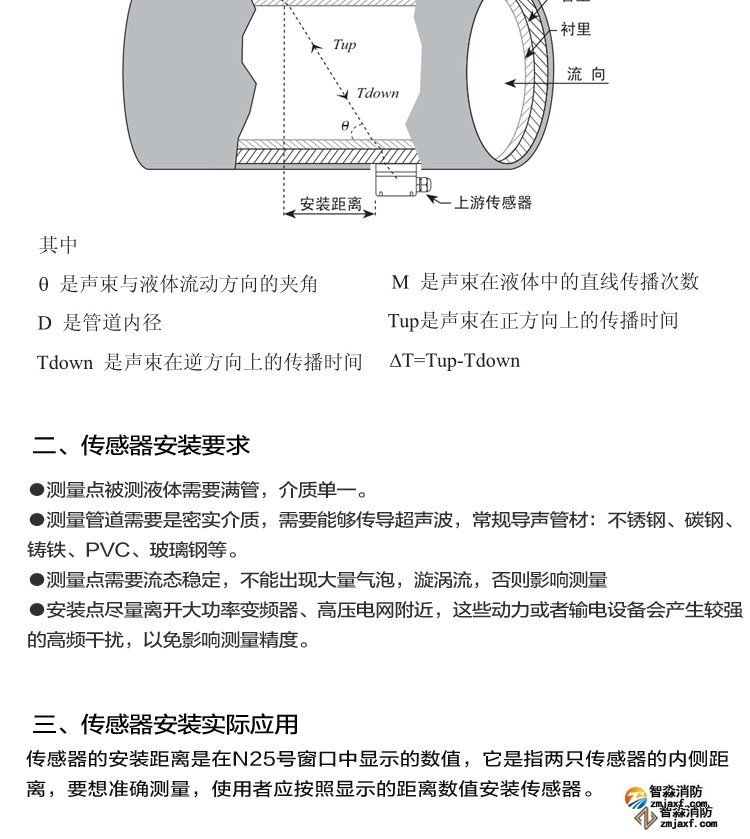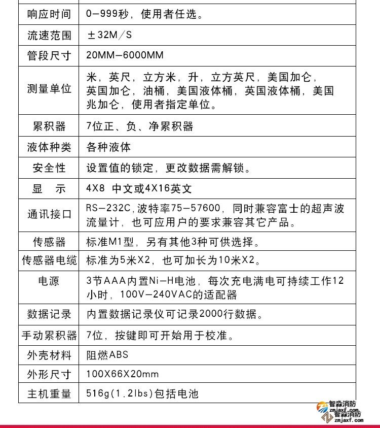 超聲波流量計測量管徑范圍:0mm~300mm;WWW.XFJCYQ.COM精度:±1%用于檢測消火栓系統和水噴淋系統的給水量以及消防豎管的流量分配。超聲波在流動的流體中傳播時就載上流體流速的信息。因此通過接收到的超聲波就可以檢測出流體的流速,從而換算成流量,圖1。圖1 超聲波流量計(一)、... 超聲波流量計測量管徑范圍:0mm~300mm;WWW.XFJCYQ.COM精度:±1%用于檢測消火栓系統和水噴淋系統的給水量以及消防豎管的流量分配。