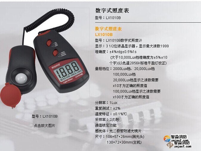 數字照度計量程不小于2000lx;精度:±5%測量消防應急照明設施的照度值是否符合規范要求照度計是一種測量光度、亮度的專用儀器儀表。光照度是物體被照明的程度,即物體表面所得到的光通量與被照面積之比,單位為勒克司(lux,法定符號lx),圖2-1。圖2-1照度計(一)、應用范圍在消防監督檢查工作中一般... 數字照度計量程不小于2000lx;精度:±5%測量消防應急照明設施的照度值是否符合規范要求
