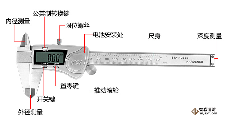 游標卡尺量程不小于150m;精度:0.02mm消防水管件,滅火器直徑等...