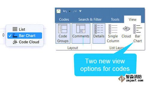 云視圖和條形圖視圖中的代碼與列表視圖中的代碼具有相同的上下文菜單。因此,您可以按照從列表視圖中使用的相同方式處理代碼,即合并、拆分或重命名代碼、編寫注釋、創建智能代碼等。您可以通過代碼訪問新的視圖選項Windows版本中的Manager View選項卡,以及Mac版本中的工具欄: