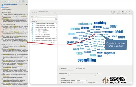 適用于Mac的ATLAS.ti中的新功能:雙擊詞云或詞列表中的詞以查找該詞在數據上下文中出現的全部部分。在Windows版ATLAS.ti中,此選項可通過上下文菜單使用。