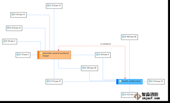 例如,將代碼鄰近添加到文檔節點或文檔組節點允許創建基于案例的網絡。您可以提出以下問題:哪些代碼已應用于哪個文檔(或文檔組)。ATLAS.ti在代碼和它們出現的文檔(文檔組)之間畫了一條藍線。
