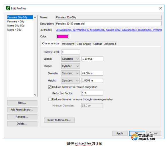 人員疏散能力模擬分析軟件Pathfinder 使用一個人員配置文件系統來管理跨組人員的參數分布。這個系統幫助你控制人員的速度、大小和視覺分布。要編輯使用者配置文件,你可以使用 Edit Profiles 對話框(圖86)。