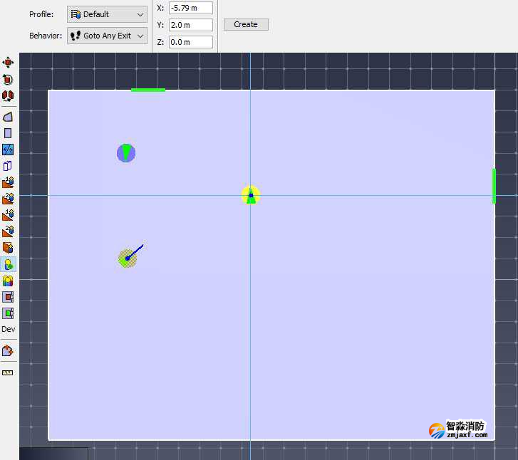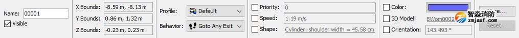 可以通過 Add Occupant 工具將個體人員添加到模型中。占用者只能放置在預先存在的房間,樓梯和斜坡,不能重疊其他占用者或房間邊界。用鼠標左鍵單擊所需的位置,或者輸入一個 x-y-z 坐標,然后從屬性面板按 Create 按鈕放置一個占用者(圖99)。