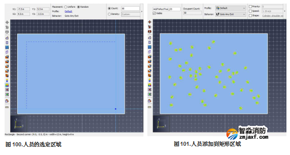 一旦屬性被指定,點擊-拖動來繪制填充矩形。矩形的兩個點必須位于同一個房間(圖100)。當你釋放鼠標按鈕時,人員將被安置在指定區域內(圖101)。