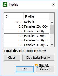 此選項允許為人員設定分布情況,例如規定增加的人員中應有25% 為30歲以下的女性,30% 為兒童等。標簽顯示當前設置的分布,如果在模型中定義了多個概要文件,則可以單擊該值來編輯分布。這將打開一個對話框,如圖103所示。